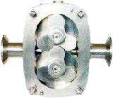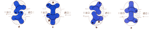 ZB3A型不锈钢转子泵依靠两个同步反转动的转子在旋转过程中于进口处产生吸力(真空度),从而吸入所要输送的物料。两转子将转子室分隔几个小空间,并按 a b c d 的次序运转;运转至位置 a 时,只有 I 室中充满介质;到位置 b 时,B室中封闭了部分介质;到位置 c 时,A 室 中也封闭了部分介质;到位置 d 时,A、B 室与 II 室相通,介质既被输送至出料口。